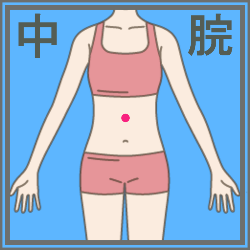 中脘は、おへそとみぞおちのちょうど真ん中あたりにある、お腹の代表的なツボです。